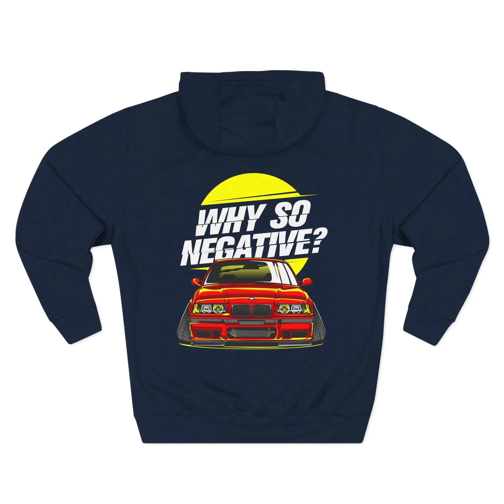 BMW E36 "Why So Negative" Hoodie — Three-Panel Fleece Car Enthusiast Pullover